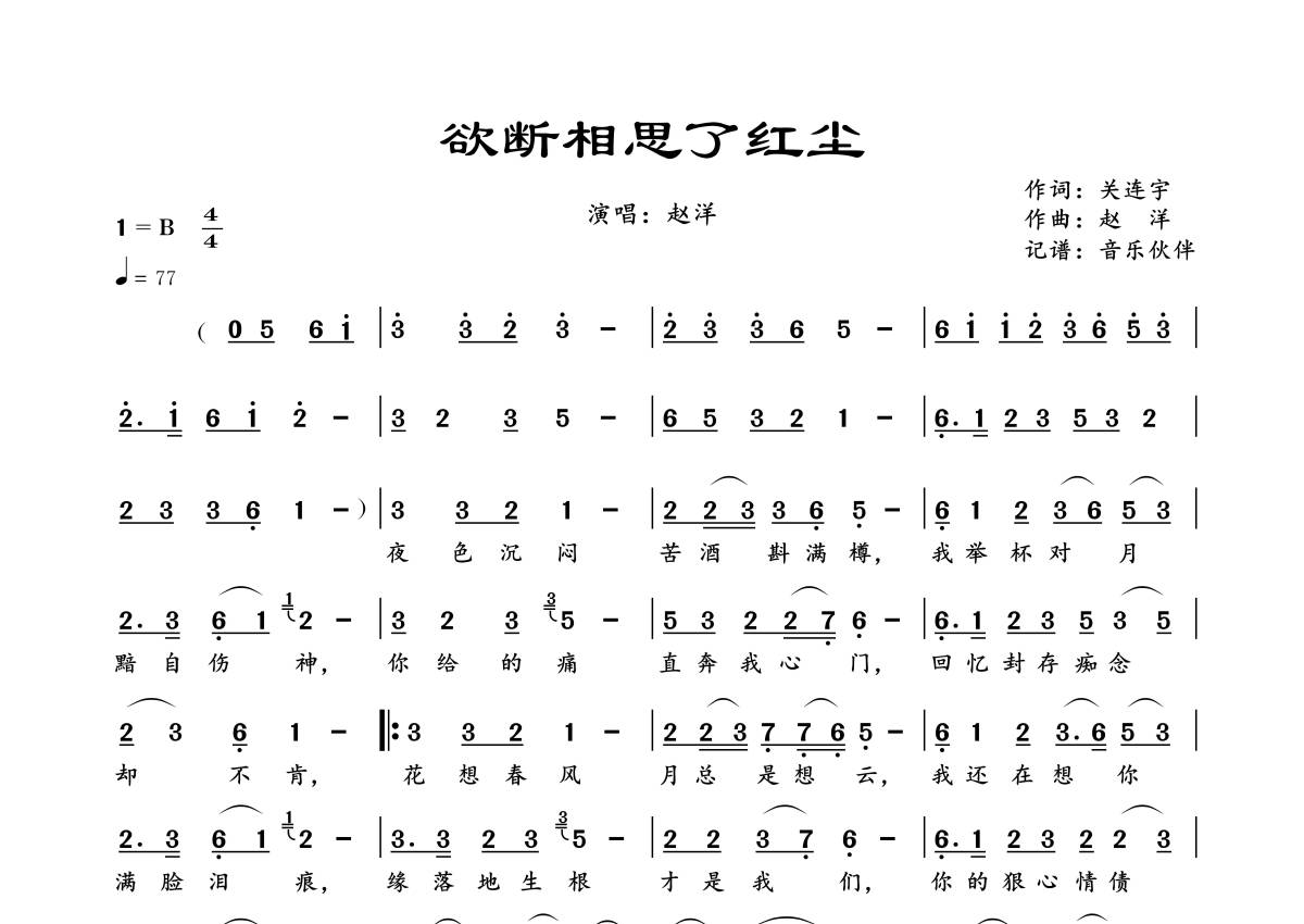 《欲断相思了红尘》是赵洋演唱的一首歌曲,拍号为4/4拍,歌曲速度为每分钟77拍,这份简谱共有一张高清图谱,图谱由 @音乐伙伴 编配上传。