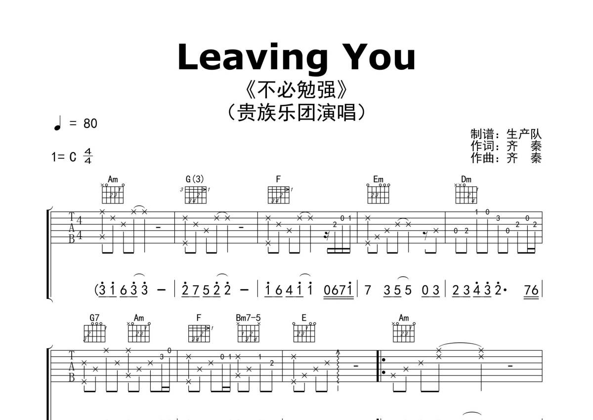 《Leaving You(不必勉强)》是不必勉强演唱的一首歌曲,精编完美版,拍号为4/4拍,歌曲速度为每分钟80拍,歌曲原调为C调,本吉他谱采用的是C调指法编配,演奏时不需要使用变调夹即为原调,这份吉他谱共有三张高清图谱,图谱由 @生产队 编配上传,图谱使用六线谱编配,包含吉他和弦指法、简谱以及歌词部分,使用这份Leaving You(不必勉强)吉他谱,可以让你更加方便地掌握这首歌曲的弹唱技巧,快来尝试吧。