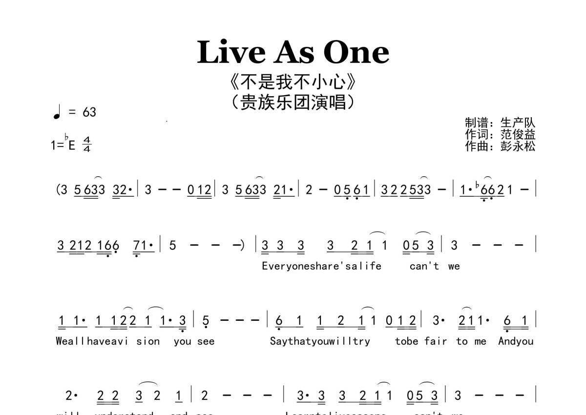《Live As One(不是我不小心)》是不是我不小心演唱的一首歌曲,原版简谱,拍号为4/4拍,歌曲速度为每分钟63拍,这份简谱共有两张高清图谱,图谱由 @生产队 编配上传。