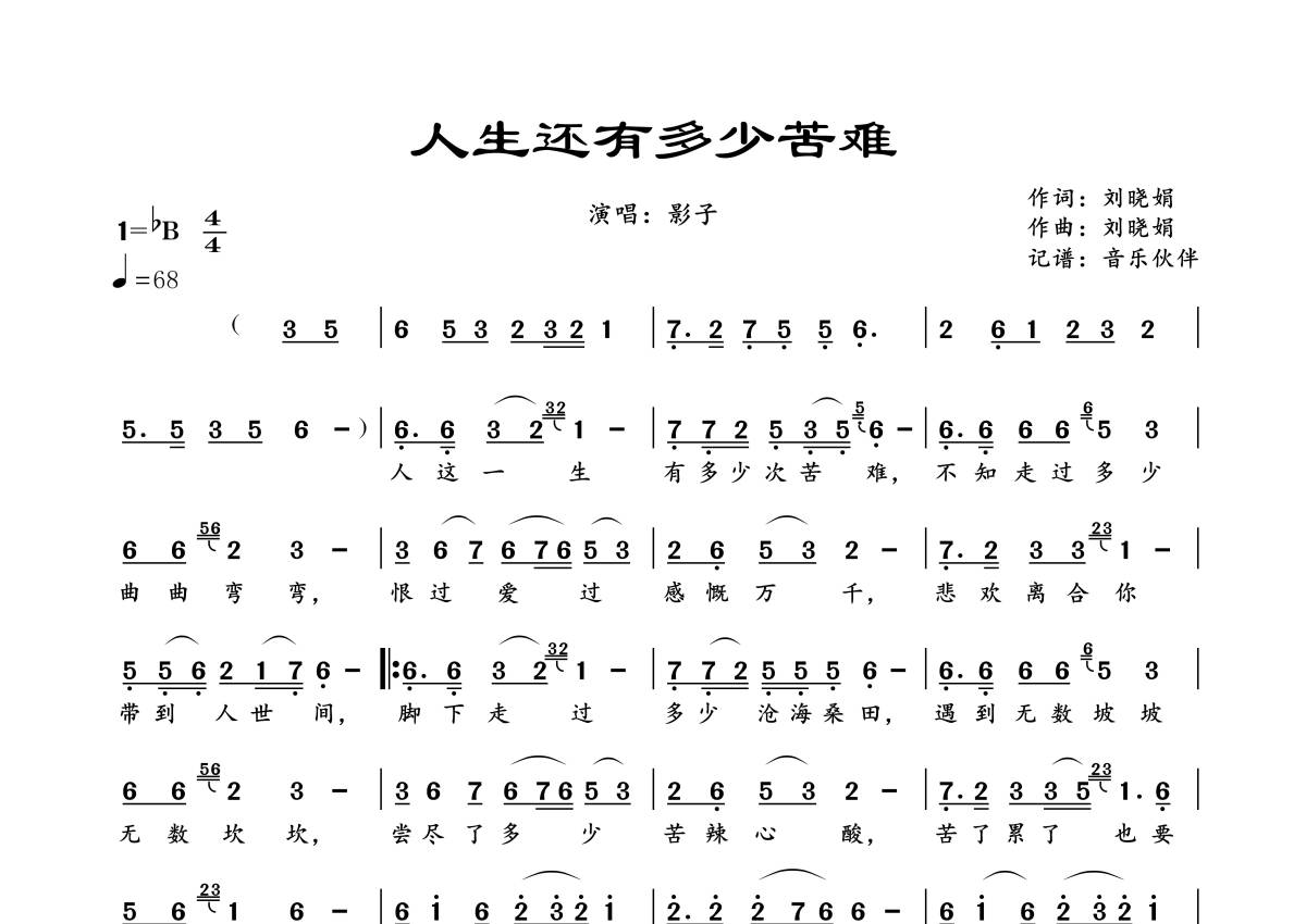 《人生还有多少苦难》是影子演唱的一首歌曲,拍号为4/4拍,歌曲速度为每分钟68拍,这份简谱共有一张高清图谱,图谱由 @音乐伙伴 编配上传。