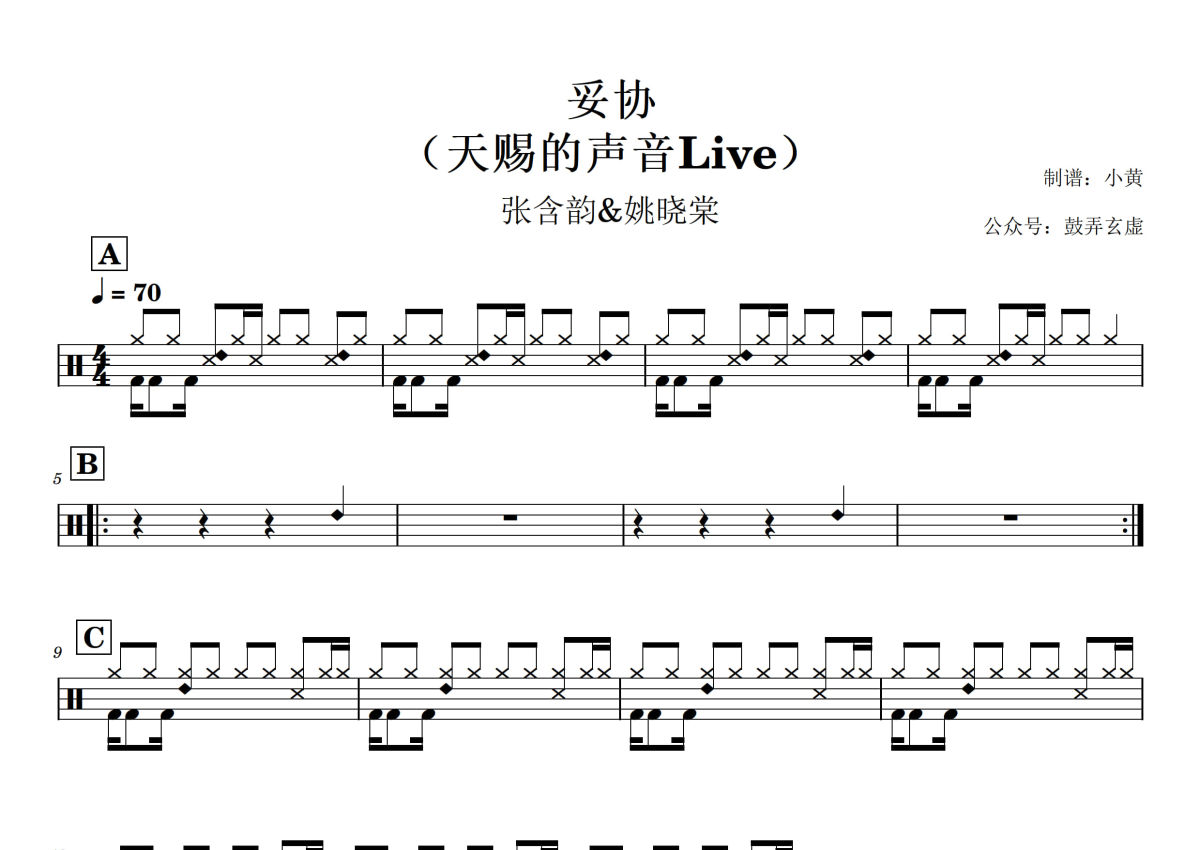 《妥协》是张含韵&姚晓棠演唱的一首歌曲,Live版,拍号为4/4拍,歌曲速度为每分钟70拍,这份架子鼓谱共有三张高清图谱,图谱由 @小黄 编配上传,图谱使用五线谱编配,使用这份妥协架子鼓谱,你将能够轻松地敲打出这首张含韵&姚晓棠的妥协,快来尝试吧。
