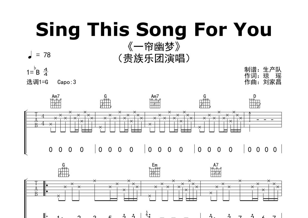 《Sing This Song For You(一帘幽梦)》是一帘幽梦演唱的一首歌曲,精编完美版,拍号为4/4拍,歌曲速度为每分钟78拍,歌曲原调为Bb调,但由于原调指法比较难,为了方便弹奏,本吉他谱采用的是G调指法编配,变调夹3品弹奏即为原调,当然也可以根据自己的音域改变变调夹位置,或者通过改变和弦调性,以方便自己弹奏,这份吉他谱共有两张高清图谱,图谱由 @生产队 编配上传,图谱使用六线谱编配,包含吉他和弦指法、简谱以及歌词部分,使用这份Sing This Song For You(一帘幽梦)吉他谱,可以让你更加方便地掌握这首歌曲的弹唱技巧,快来尝试吧。