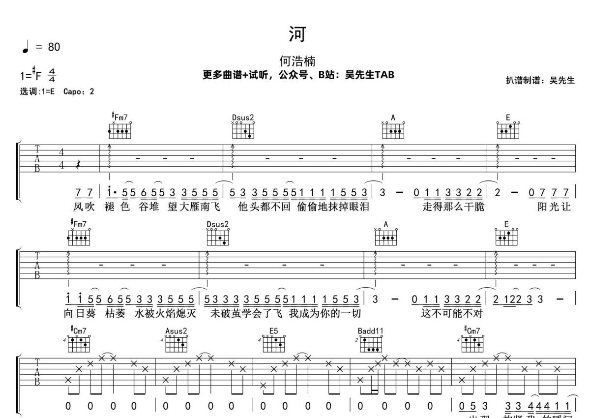 何浩楠《河》吉他谱 - E调弹唱六线谱