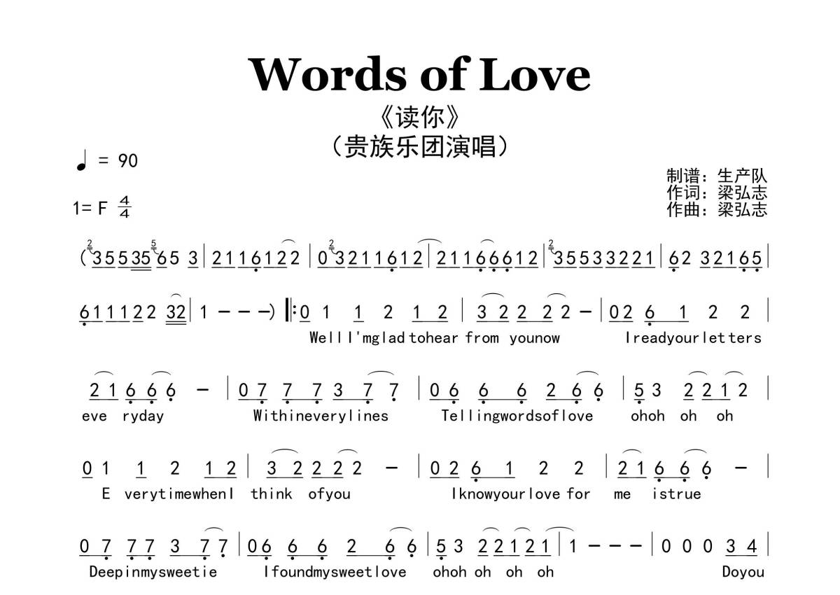 《Words of Love》是贵族乐团演唱的一首歌曲,原版简谱,拍号为4/4拍,歌曲速度为每分钟90拍,这份简谱共有一张高清图谱,图谱由 @生产队 编配上传。