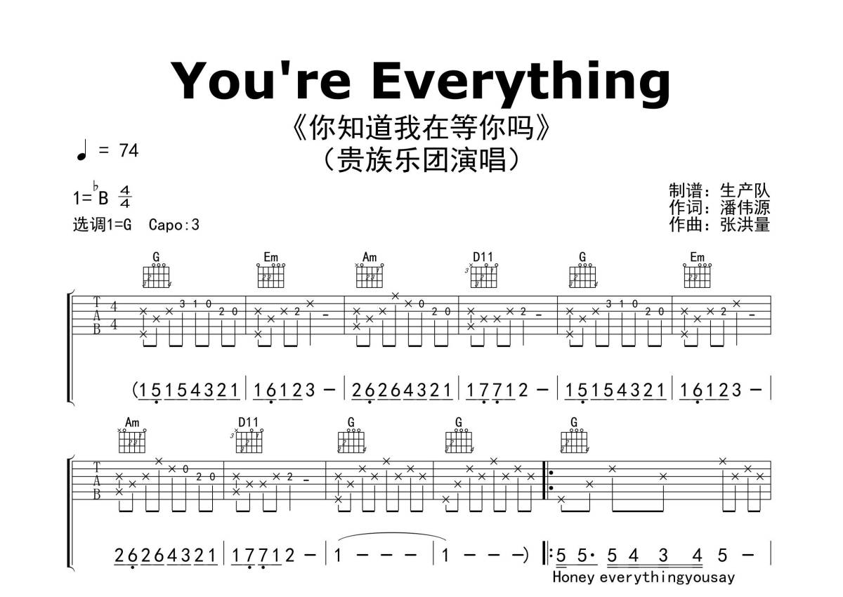 《You're Everything》是贵族乐团演唱的一首歌曲,精编完美版,拍号为4/4拍,歌曲速度为每分钟74拍,歌曲原调为Bb调,但由于原调指法比较难,为了方便弹奏,本吉他谱采用的是G调指法编配,变调夹3品弹奏即为原调,当然也可以根据自己的音域改变变调夹位置,或者通过改变和弦调性,以方便自己弹奏,这份吉他谱共有三张高清图谱,图谱由 @生产队 编配上传,图谱使用六线谱编配,包含吉他和弦指法、简谱以及歌词部分,使用这份You're Everything吉他谱,可以让你更加方便地掌握这首歌曲的弹唱技巧,快来尝试吧。