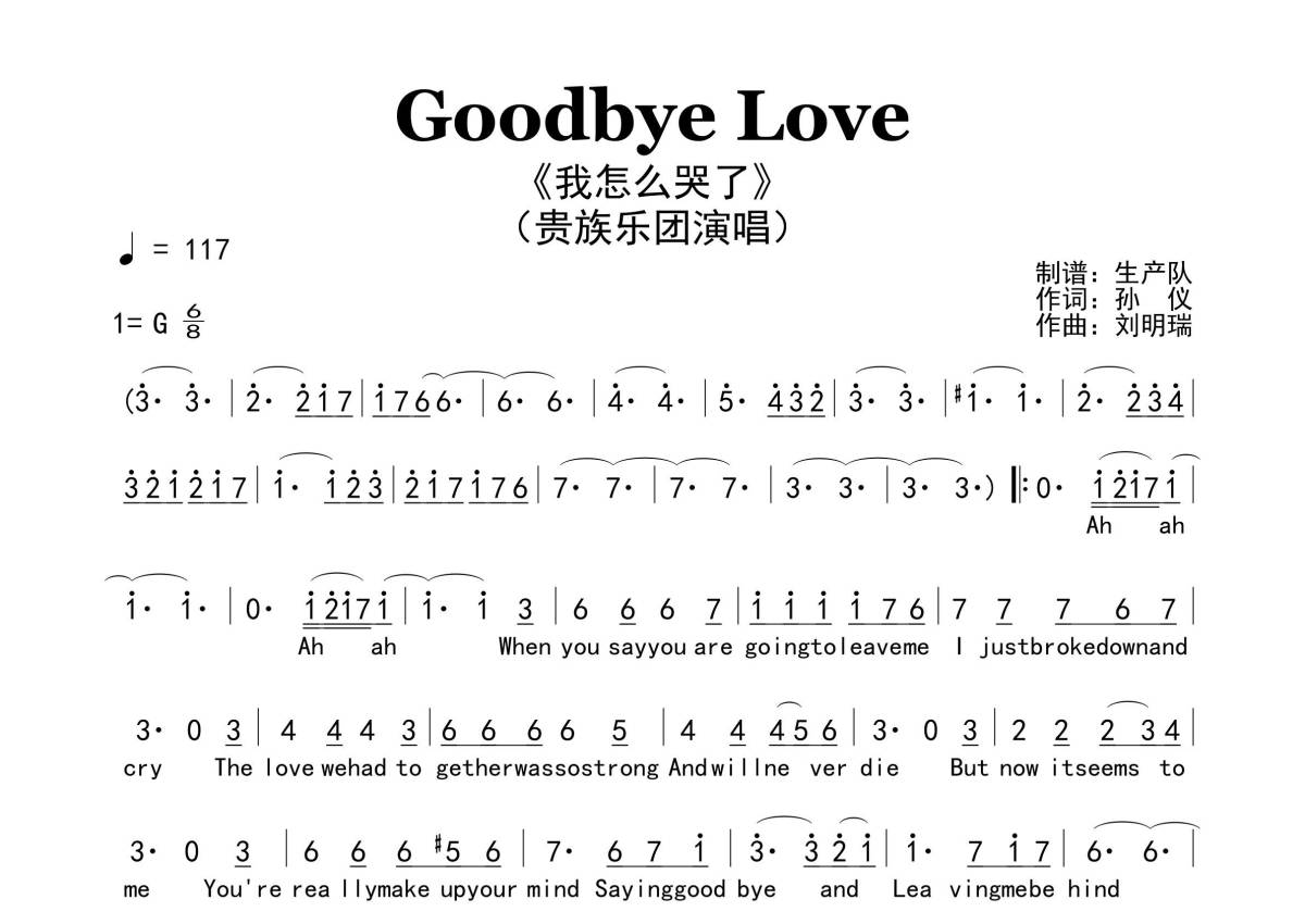 《Goodbye Love》是贵族乐团演唱的一首歌曲,原版简谱,拍号为6/8拍,歌曲速度为每分钟117拍,这份简谱共有一张高清图谱,图谱由 @生产队 编配上传。
