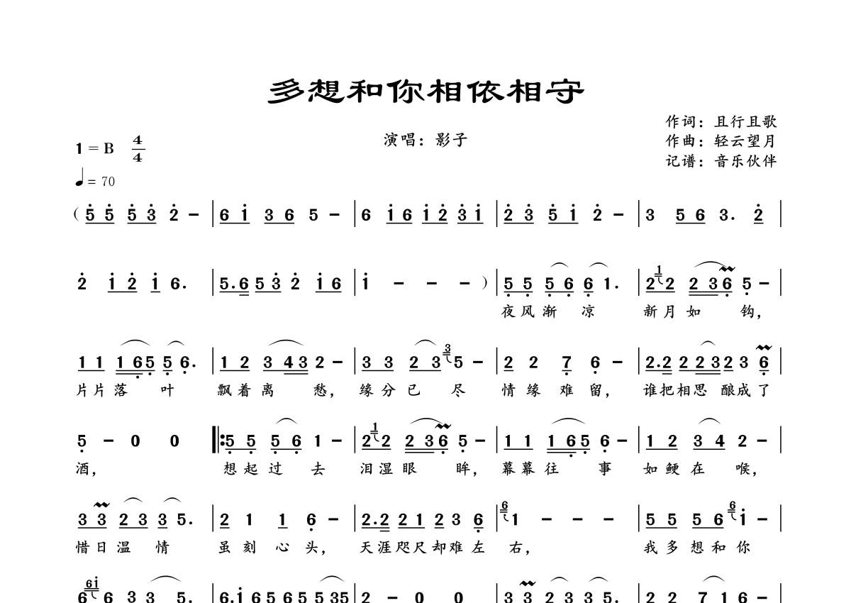 《多想和你相依相守》是影子演唱的一首歌曲,拍号为4/4拍,歌曲速度为每分钟70拍,这份简谱共有一张高清图谱,图谱由 @音乐伙伴 编配上传。