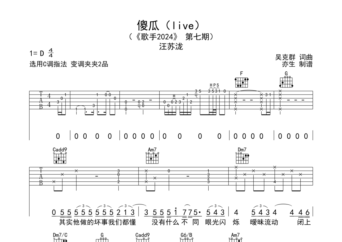 汪苏泷《傻瓜》吉他谱 - C调弹唱六线谱