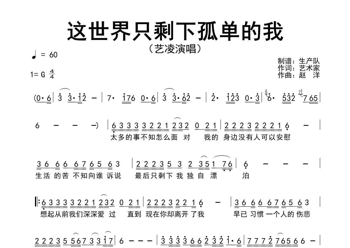《这世界只剩下孤单的我》是艺凌演唱的一首歌曲,原版简谱,拍号为4/4拍,歌曲速度为每分钟60拍,这份简谱共有一张高清图谱,图谱由 @生产队 编配上传。