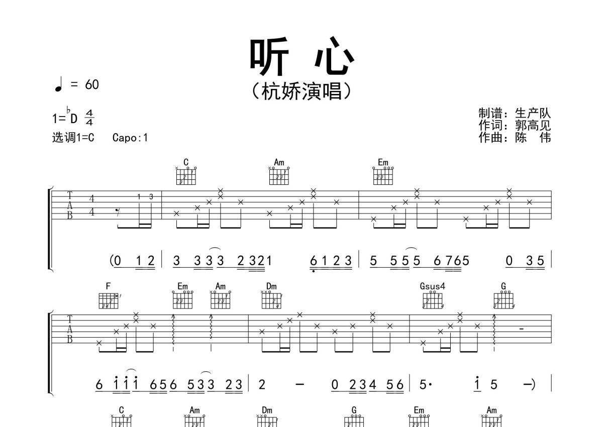 杭娇《听心》吉他谱 - C调弹唱六线谱 - 精编完美版