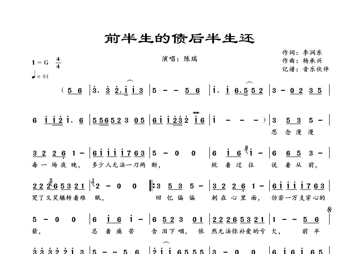 《前半生的债后半生还》是陈瑞演唱的一首歌曲,拍号为4/4拍,歌曲速度为每分钟84拍,这份简谱共有一张高清图谱,图谱由 @音乐伙伴 编配上传。