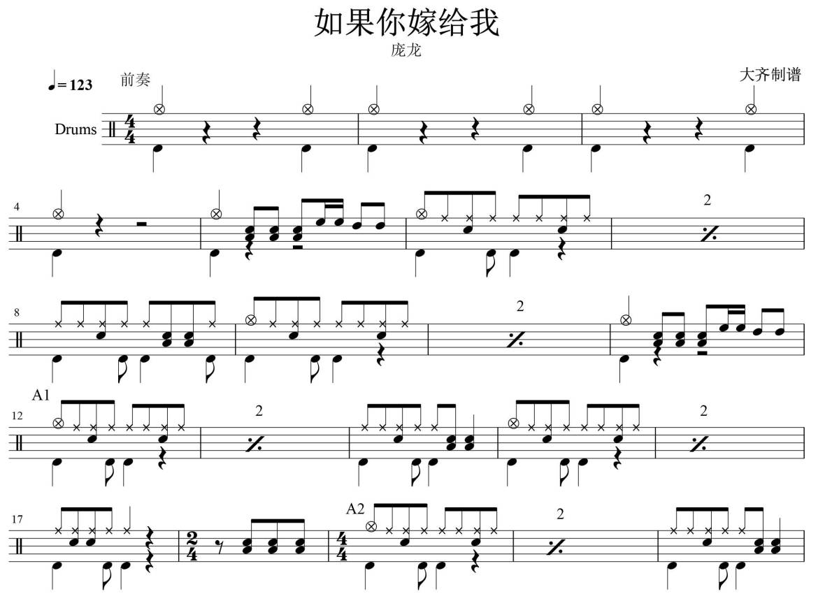《如果你嫁给我》是庞龙演唱的一首歌曲,这份架子鼓谱共有两张高清图谱,图谱由 @大张齐鼓现代打击乐培训 编配上传,图谱使用五线谱编配,使用这份如果你嫁给我架子鼓谱,你将能够轻松地敲打出这首庞龙的如果你嫁给我,快来尝试吧。《如果你嫁给我》是庞龙演唱的歌曲。