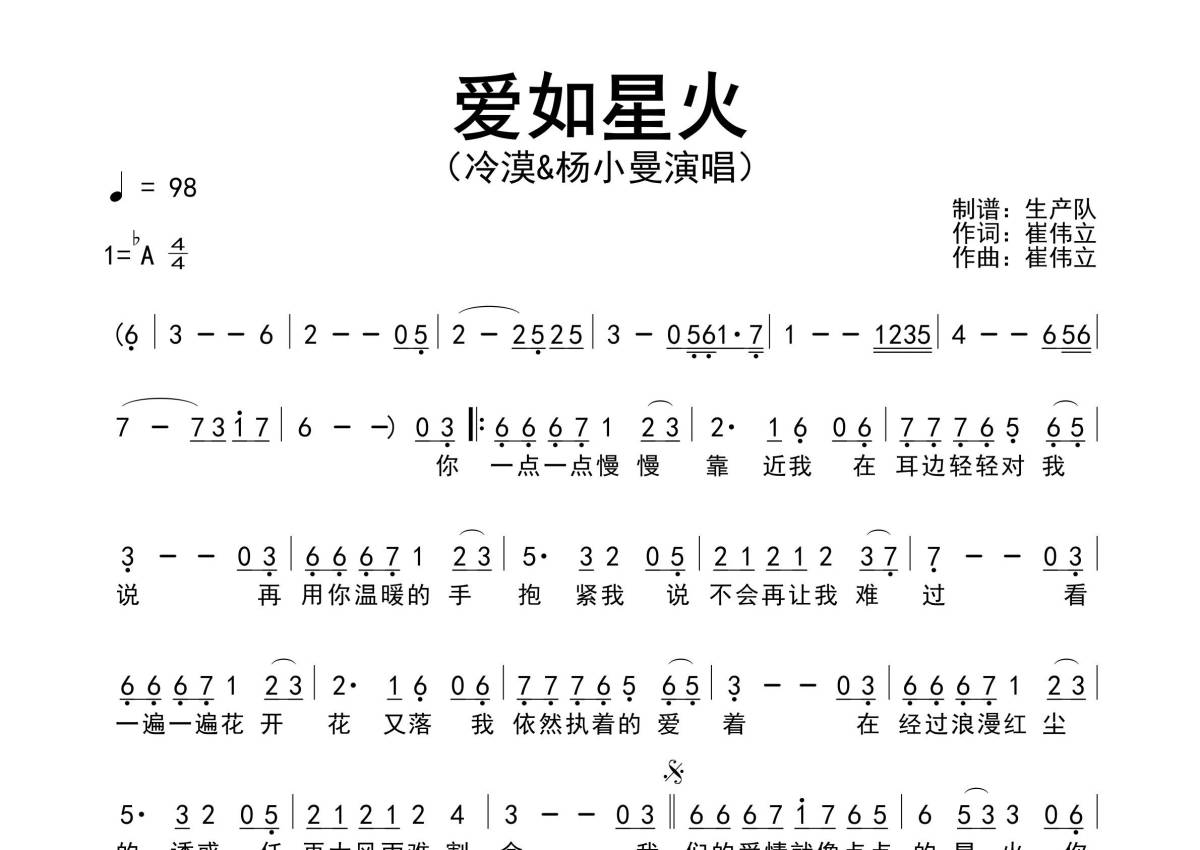 《爱如星火》是冷漠/杨小曼演唱的一首歌曲,原版简谱,拍号为4/4拍,歌曲速度为每分钟98拍,这份简谱共有一张高清图谱,图谱由 @生产队 编配上传。