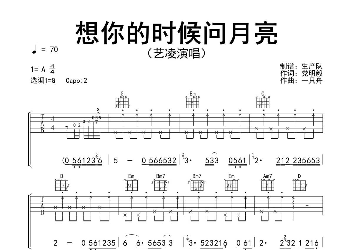 《想你的时候问月亮》是艺凌演唱的一首歌曲,精编完美版,拍号为4/4拍,歌曲速度为每分钟70拍,歌曲原调为A调,但由于原调指法比较难,为了方便弹奏,本吉他谱采用的是G调指法编配,变调夹2品弹奏即为原调,当然也可以根据自己的音域改变变调夹位置,或者通过改变和弦调性,以方便自己弹奏,这份吉他谱共有三张高清图谱,图谱由 @生产队 编配上传,图谱使用六线谱编配,包含吉他和弦指法、简谱以及歌词部分,使用这份想你的时候问月亮吉他谱,可以让你更加方便地掌握这首歌曲的弹唱技巧,快来尝试吧。