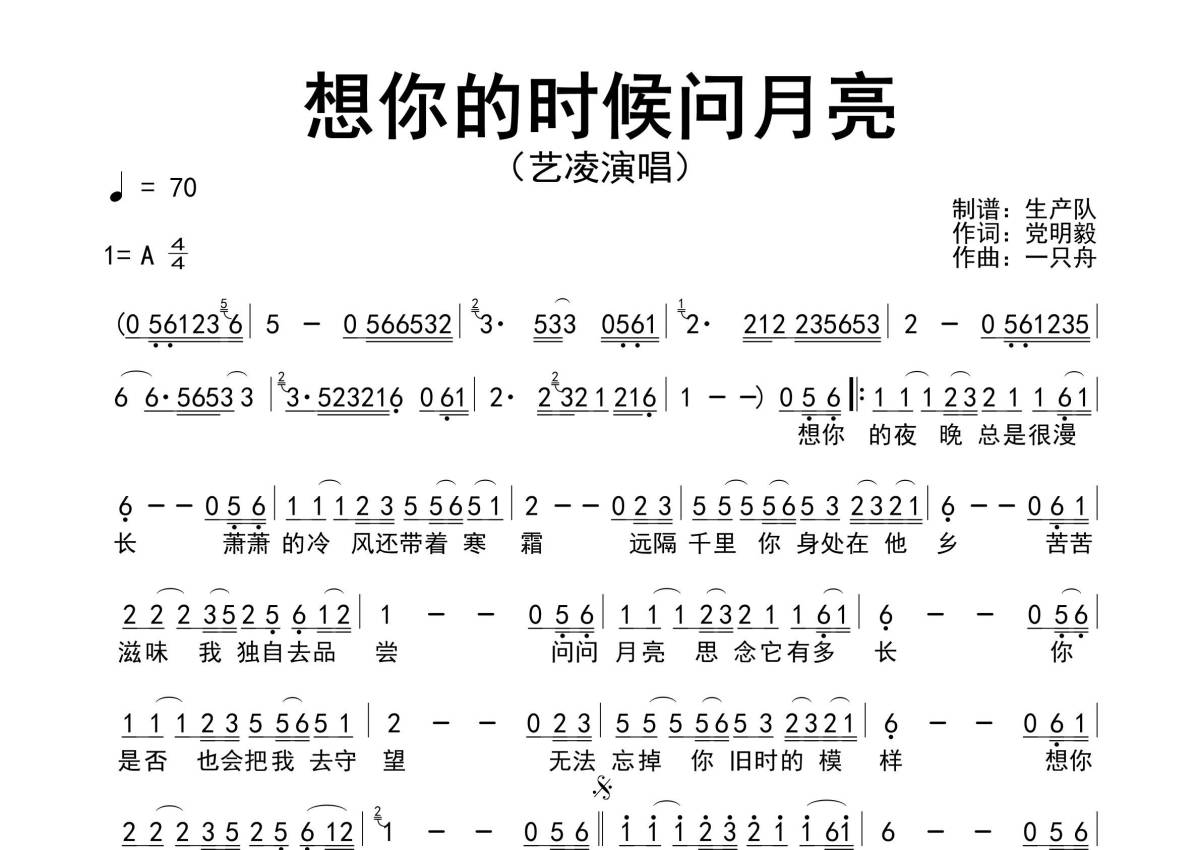 《想你的时候问月亮》是艺凌演唱的一首歌曲,原版简谱,拍号为4/4拍,歌曲速度为每分钟70拍,这份简谱共有一张高清图谱,图谱由 @生产队 编配上传。