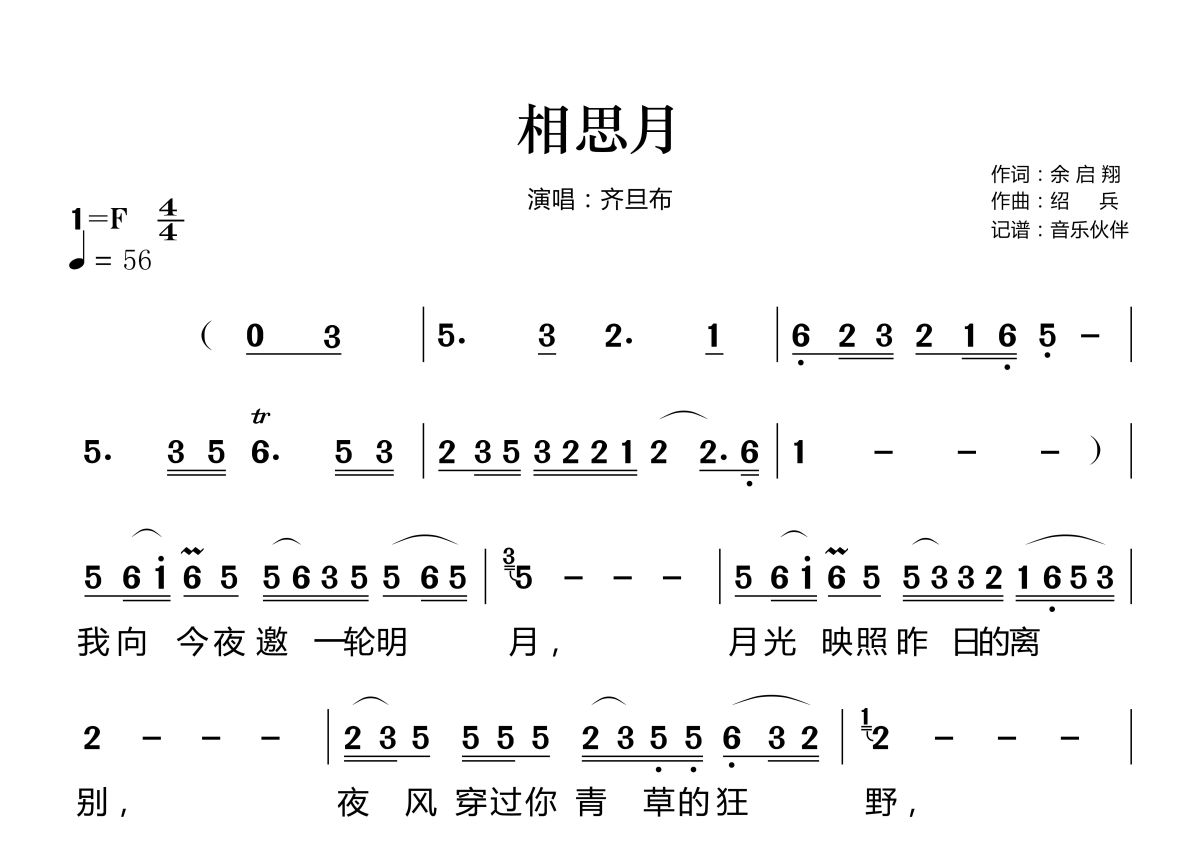 《相思月》是齐旦布演唱的一首歌曲,这份简谱共有两张高清图谱,图谱由 @音乐伙伴 编配上传。