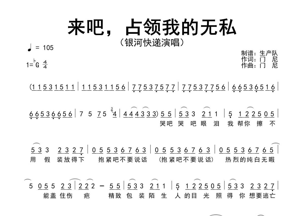 《来吧,占领我的无私》是银河快递演唱的一首歌曲,原版简谱,拍号为4/4拍,歌曲速度为每分钟105拍,这份简谱共有两张高清图谱,图谱由 @生产队 编配上传。
