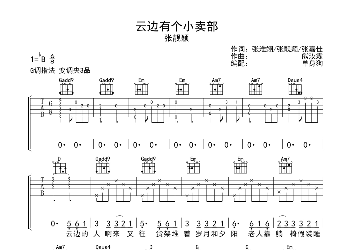 《云边有个小卖部》是张靓颖演唱的一首歌曲,拍号为6/8拍,歌曲原调为Bb调,但由于原调指法比较难,为了方便弹奏,本吉他谱采用的是G调指法编配,变调夹3品弹奏即为原调,当然也可以根据自己的音域改变变调夹位置,或者通过改变和弦调性,以方便自己弹奏,这份吉他谱共有两张高清图谱,图谱由 @单身狗 编配上传,图谱使用六线谱编配,包含吉他和弦指法、简谱以及歌词部分,使用这份云边有个小卖部吉他谱,可以让你更加方便地掌握这首歌曲的弹唱技巧,快来尝试吧。