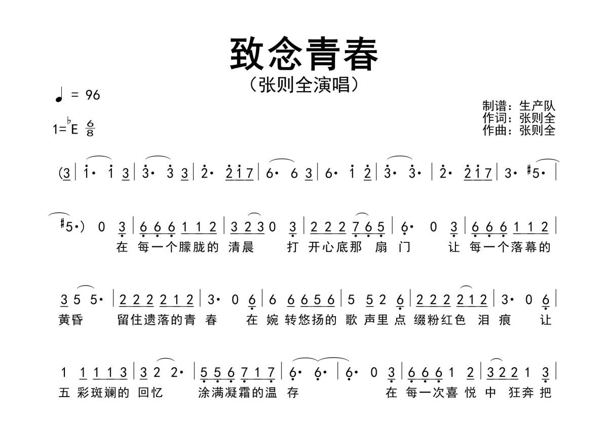 《致念青春》是张则全演唱的一首歌曲,原版简谱,拍号为6/8拍,歌曲速度为每分钟96拍,这份简谱共有两张高清图谱,图谱由 @生产队 编配上传。