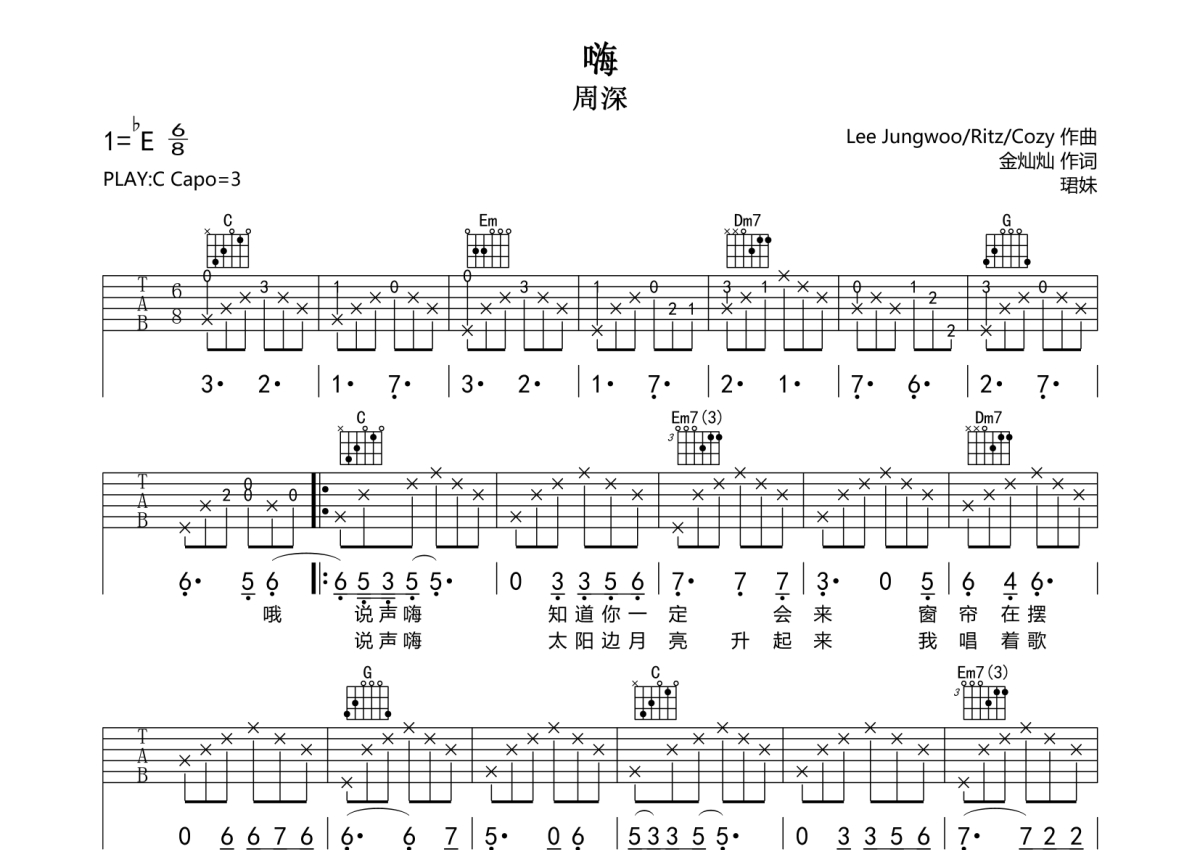 周深《嗨》吉他谱 - C调弹唱六线谱