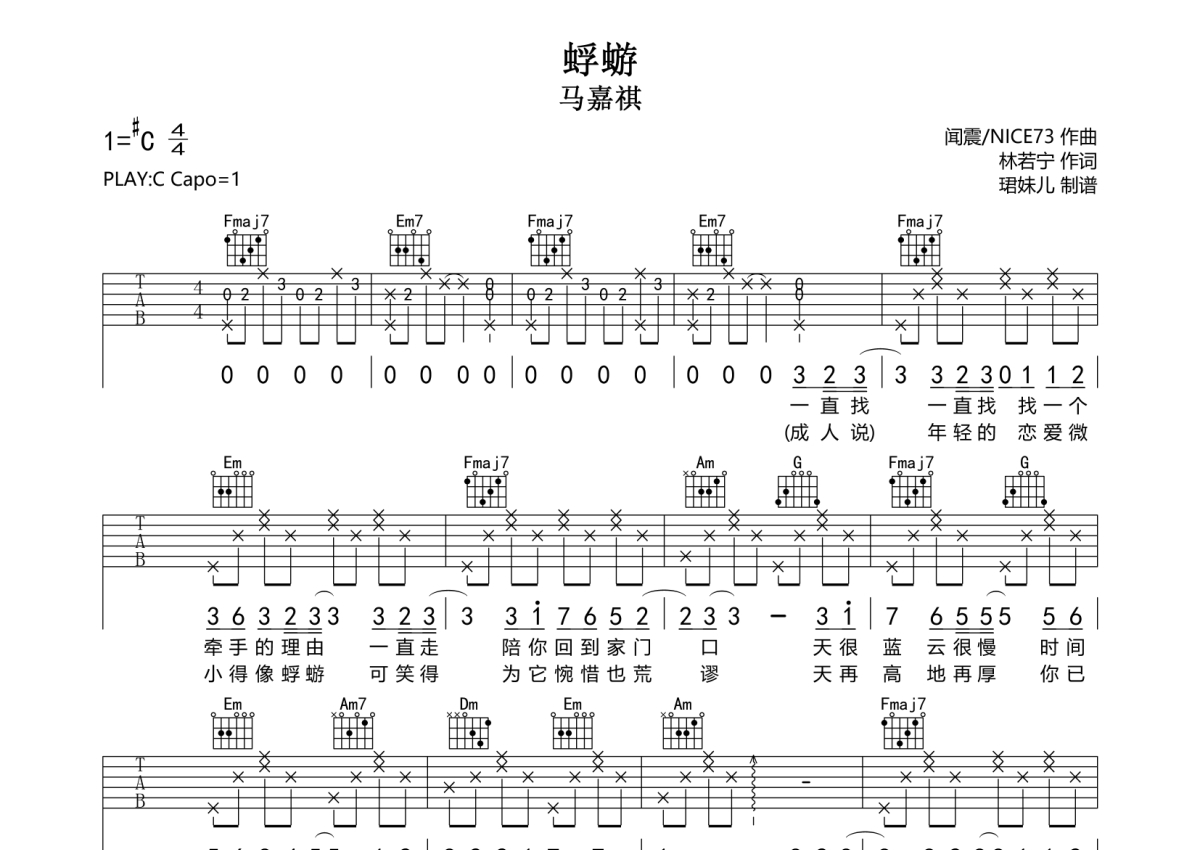 《蜉蝣》是马嘉祺演唱的一首歌曲,拍号为4/4拍,歌曲速度为每分钟85拍,歌曲原调为Db调,但由于原调指法比较难,为了方便弹奏,本吉他谱采用的是C调指法编配,变调夹1品弹奏即为原调,当然也可以根据自己的音域改变变调夹位置,或者通过改变和弦调性,以方便自己弹奏,这份吉他谱共有两张高清图谱,图谱由 @珺妹儿 编配上传,图谱使用六线谱编配,包含吉他和弦指法、简谱以及歌词部分,使用这份蜉蝣吉他谱,可以让你更加方便地掌握这首歌曲的弹唱技巧,快来尝试吧。