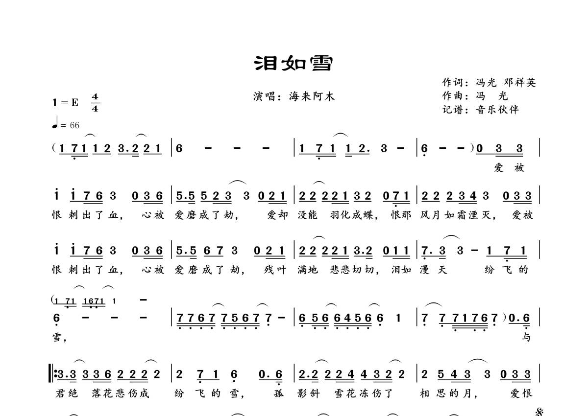 《泪如雪》是海来阿木演唱的一首歌曲,拍号为4/4拍,歌曲速度为每分钟66拍,这份简谱共有一张高清图谱,图谱由 @音乐伙伴 编配上传。