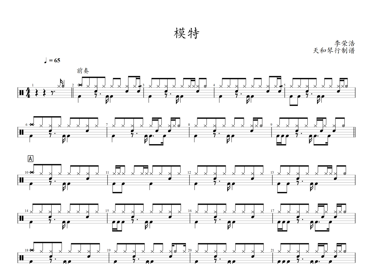 李荣浩《模特》架子鼓谱
