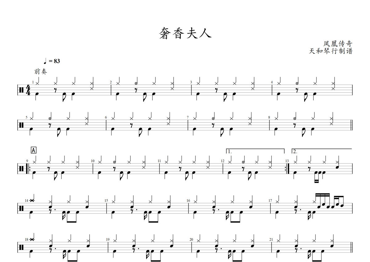 《奢香夫人》是凤凰传奇演唱的一首歌曲,拍号为4/4拍,歌曲速度为每分钟83拍,这份架子鼓谱共有两张高清图谱,图谱由 @音符喷血者 编配上传,图谱使用五线谱编配,使用这份奢香夫人架子鼓谱,你将能够轻松地敲打出这首凤凰传奇的奢香夫人,快来尝试吧。