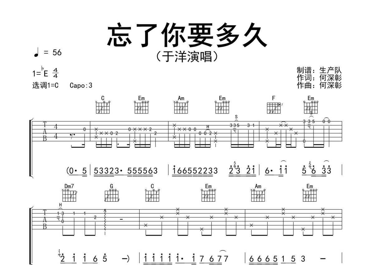 《忘了你要多久》是于洋演唱的一首歌曲,精编完美版,拍号为4/4拍,歌曲速度为每分钟56拍,歌曲原调为Eb调,但由于原调指法比较难,为了方便弹奏,本吉他谱采用的是C调指法编配,变调夹3品弹奏即为原调,当然也可以根据自己的音域改变变调夹位置,或者通过改变和弦调性,以方便自己弹奏,这份吉他谱共有三张高清图谱,图谱由 @生产队 编配上传,图谱使用六线谱编配,包含吉他和弦指法、简谱以及歌词部分,使用这份忘了你要多久吉他谱,可以让你更加方便地掌握这首歌曲的弹唱技巧,快来尝试吧。
