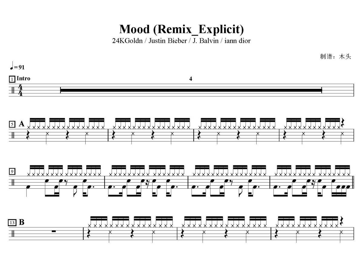 《Mood》是24KGoldn / Justin Bieber / J. Balvin / iann dior演唱的一首歌曲,这份鼓谱共有两张高清图谱,图谱由 @打鼓谱 编配上传,图谱使用五线谱编配,使用这份Mood架子鼓谱,你将能够轻松地敲打出这首24KGoldn / Justin Bieber / J. Balvin / iann dior的Mood,快来尝试吧。歌曲名:Mood (Remix|Explicit),歌手名:24KGoldn / Justin Bieber / J. Balvin / iann dior,专辑名:Mood (Remix) [Explicit]。