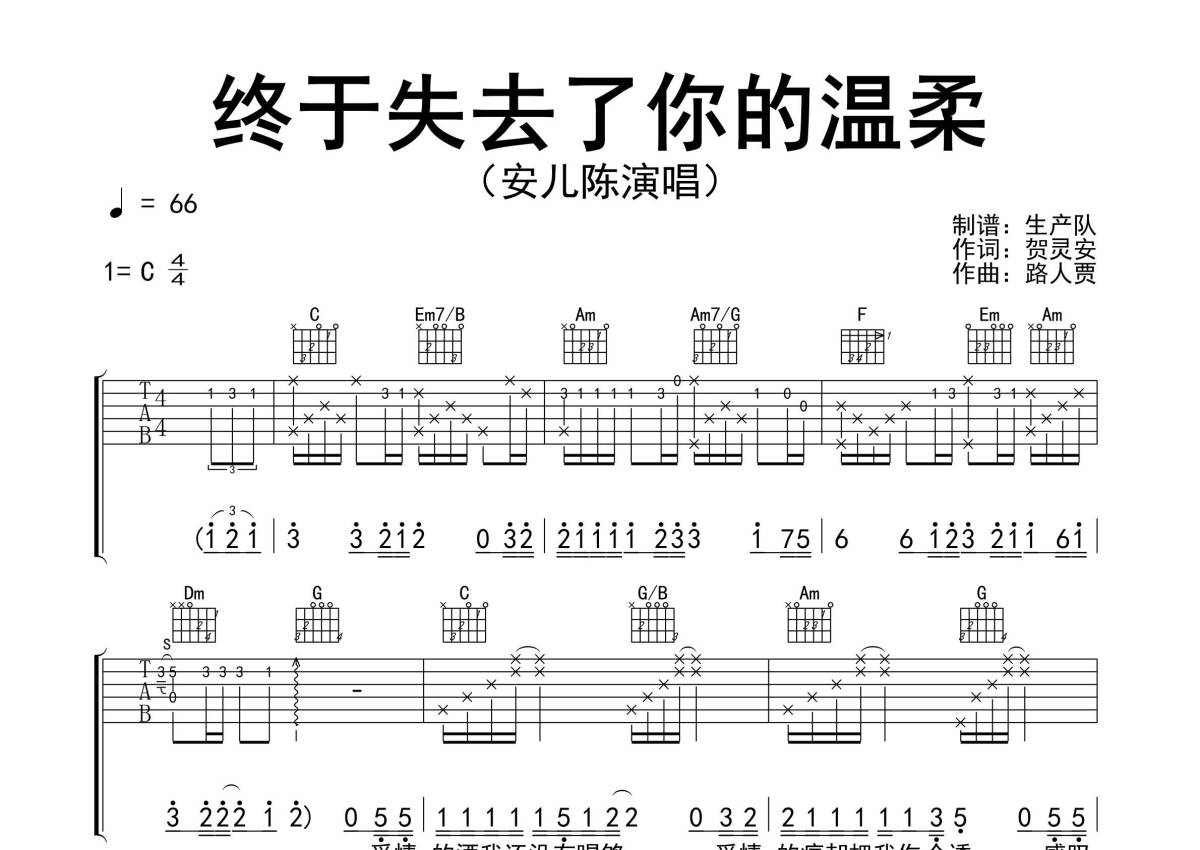 《终于失去了你的温柔》是安儿陈演唱的一首歌曲,精编完美版,拍号为4/4拍,歌曲速度为每分钟66拍,歌曲原调为C调,本吉他谱采用的是C调指法编配,演奏时不需要使用变调夹即为原调,这份吉他谱共有三张高清图谱,图谱由 @生产队 编配上传,图谱使用六线谱编配,包含吉他和弦指法、简谱以及歌词部分,使用这份终于失去了你的温柔吉他谱,可以让你更加方便地掌握这首歌曲的弹唱技巧,快来尝试吧。