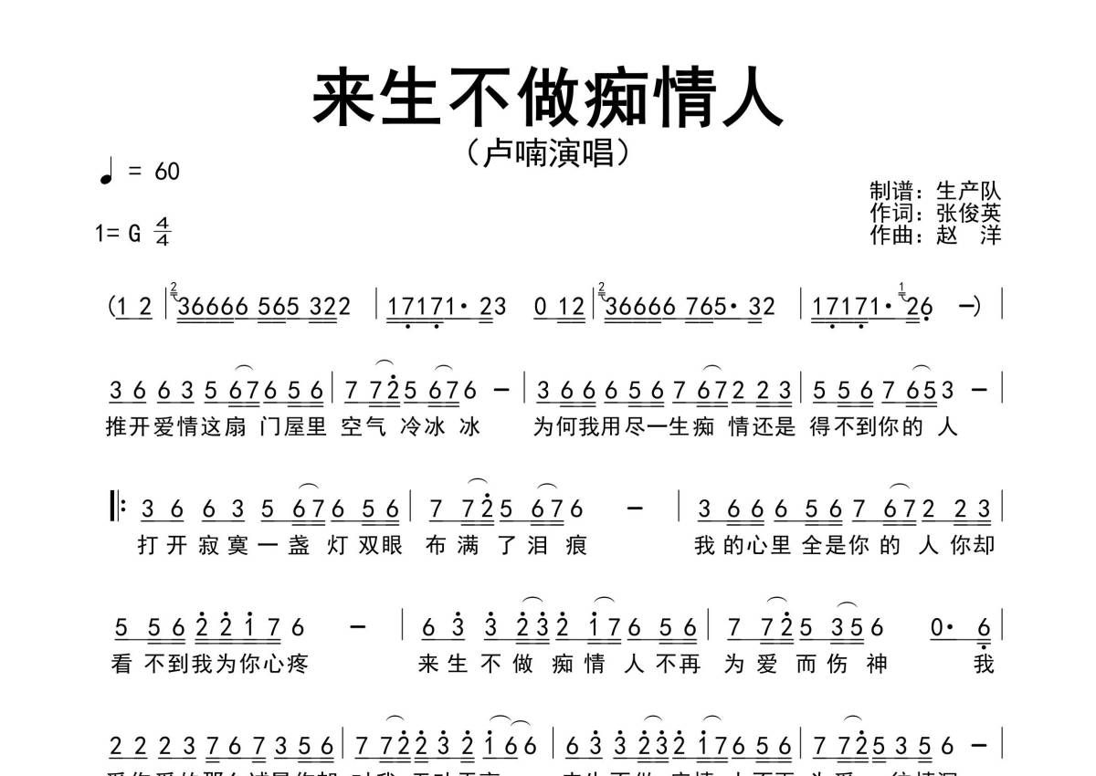 《来生不做痴情人》是卢喃演唱的一首歌曲,原版简谱,拍号为4/4拍,歌曲速度为每分钟60拍,这份简谱共有一张高清图谱,图谱由 @生产队 编配上传。