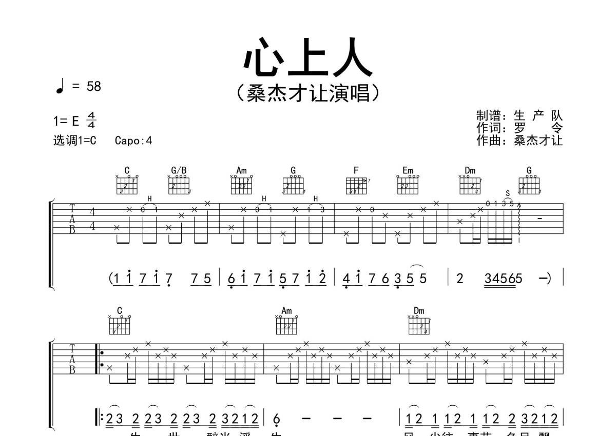 《心上人》是桑杰才让演唱的一首歌曲,精编完美版,拍号为4/4拍,歌曲速度为每分钟58拍,歌曲原调为E调,但由于原调指法比较难,为了方便弹奏,本吉他谱采用的是C调指法编配,变调夹4品弹奏即为原调,当然也可以根据自己的音域改变变调夹位置,或者通过改变和弦调性,以方便自己弹奏,这份吉他谱共有三张高清图谱,图谱由 @生产队 编配上传,图谱使用六线谱编配,包含吉他和弦指法、简谱以及歌词部分,使用这份心上人吉他谱,可以让你更加方便地掌握这首歌曲的弹唱技巧,快来尝试吧。
