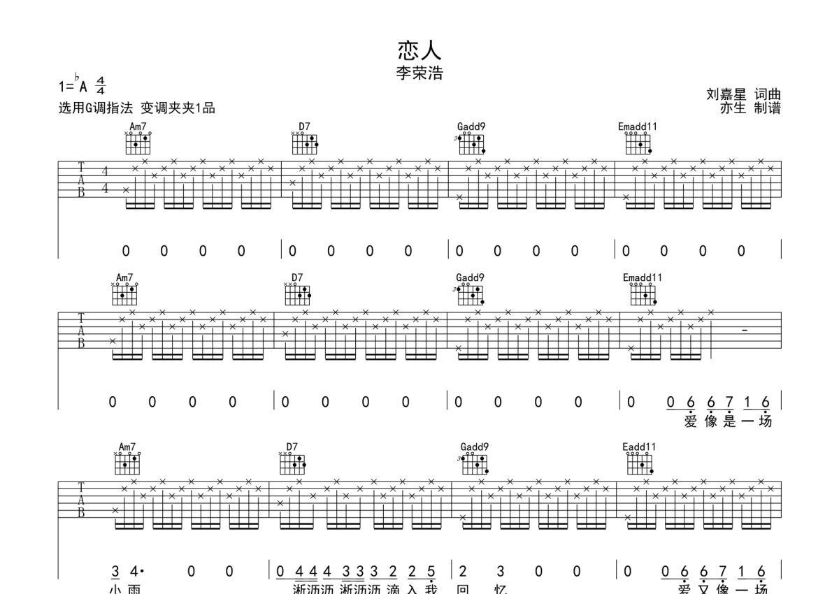 《恋人》是李荣浩演唱的一首歌曲,拍号为4/4拍,歌曲原调为Ab调,但由于原调指法比较难,为了方便弹奏,本吉他谱采用的是G调指法编配,变调夹1品弹奏即为原调,当然也可以根据自己的音域改变变调夹位置,或者通过改变和弦调性,以方便自己弹奏,这份吉他谱共有两张高清图谱,图谱由 @亦生 编配上传,图谱使用六线谱编配,包含吉他和弦指法、简谱以及歌词部分,使用这份恋人吉他谱,可以让你更加方便地掌握这首歌曲的弹唱技巧,快来尝试吧。