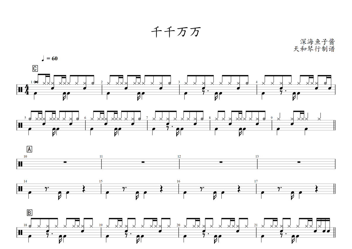 《千千万万》是深海鱼子酱演唱的一首歌曲,拍号为4/4拍,歌曲速度为每分钟60拍,这份架子鼓谱共有两张高清图谱,图谱由 @音符喷血者 编配上传,图谱使用五线谱编配,使用这份千千万万架子鼓谱,你将能够轻松地敲打出这首深海鱼子酱的千千万万,快来尝试吧。