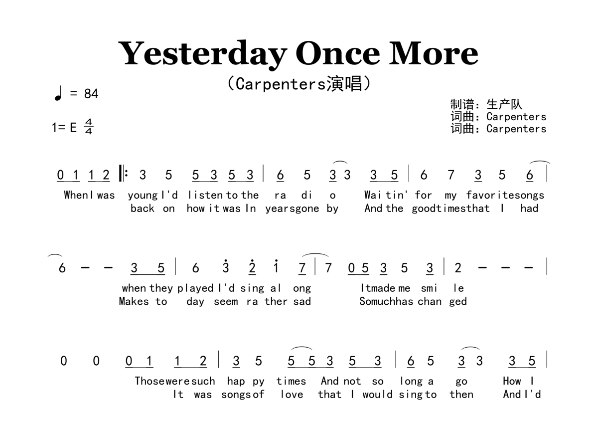 《Yesterday Once More》是Carpenters演唱的一首歌曲,原版简谱,拍号为4/4拍,歌曲速度为每分钟84拍,这份简谱共有两张高清图谱,图谱由 @生产队 编配上传。