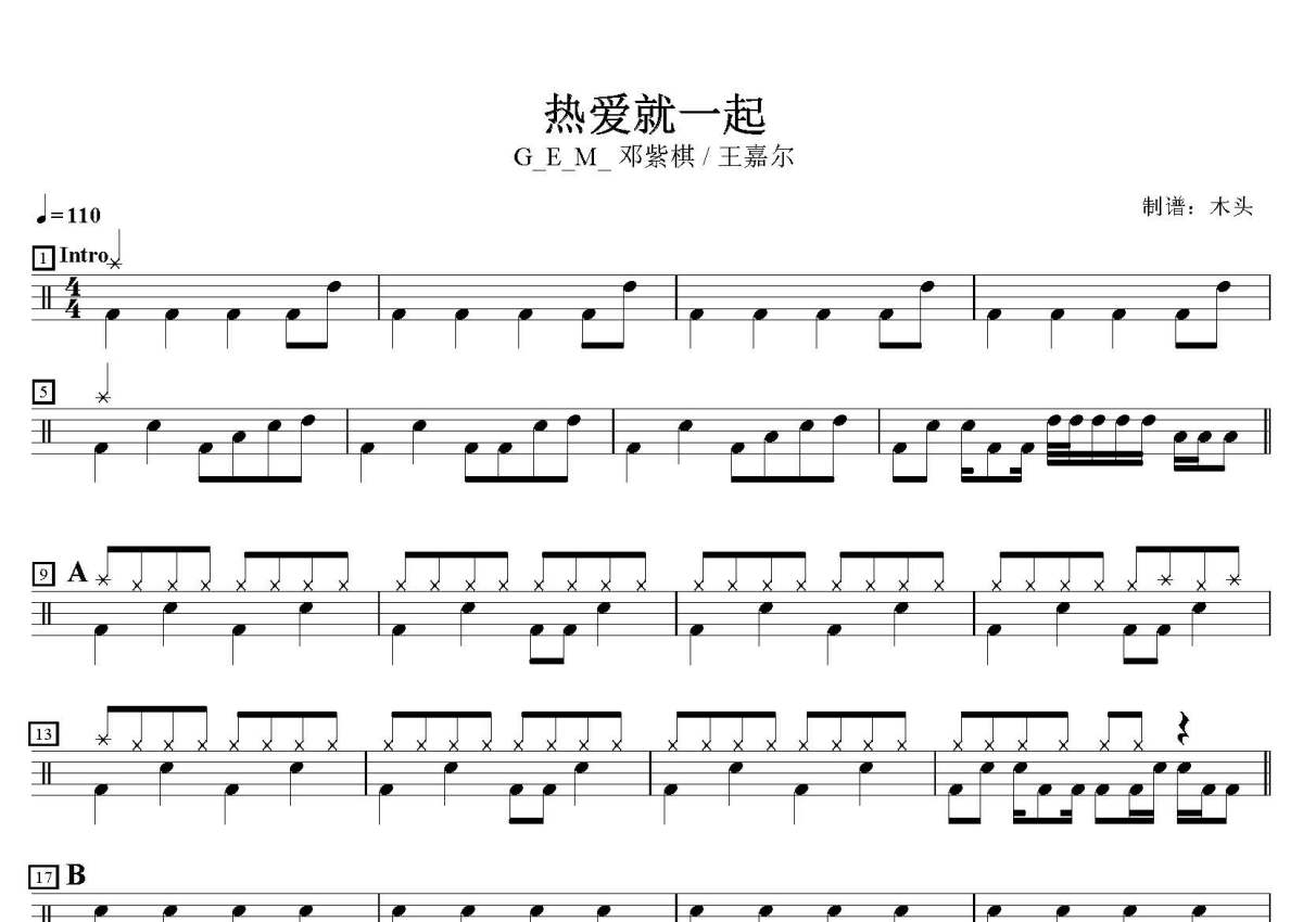 G_E_M_ 邓紫棋 / 王嘉尔《热爱就一起》鼓谱 - 架子鼓谱