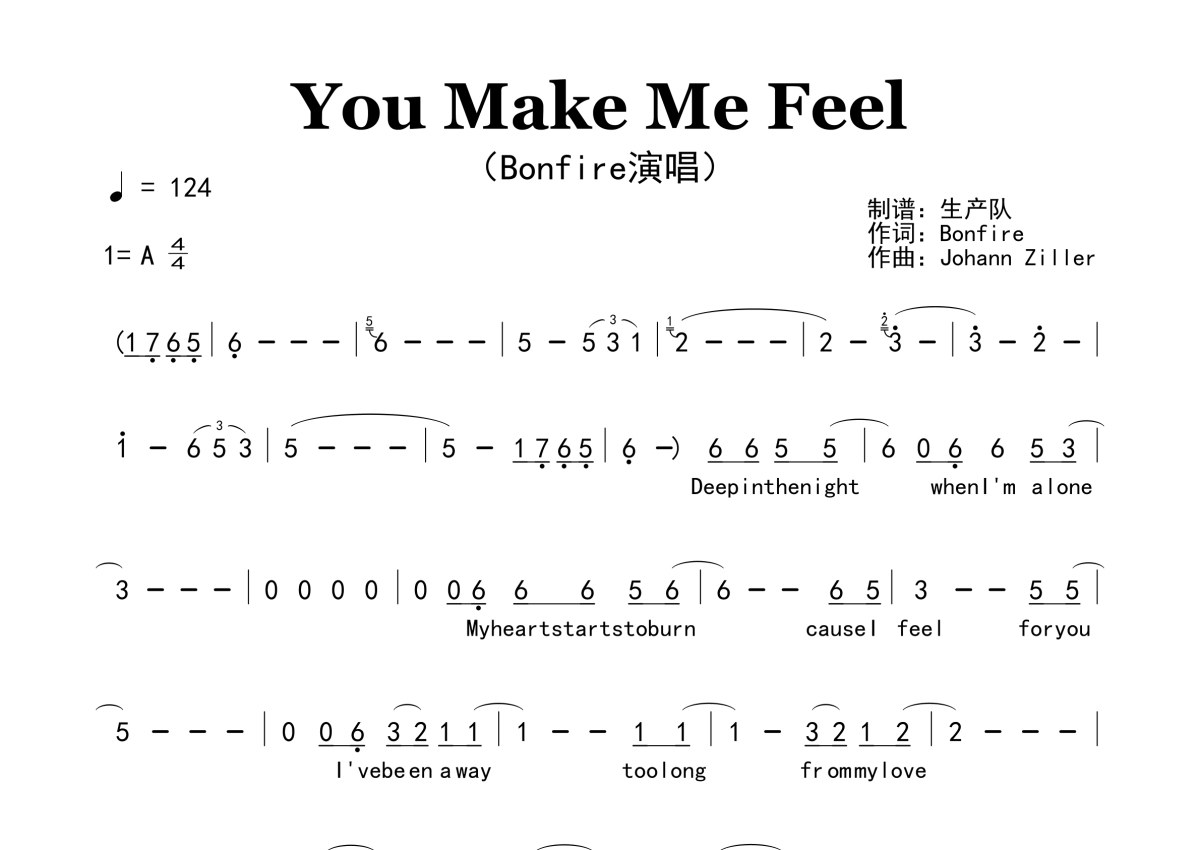 《You Make Me Feel》是Bonfire演唱的一首歌曲,原版简谱,拍号为4/4拍,歌曲速度为每分钟124拍,这份简谱共有两张高清图谱,图谱由 @生产队 编配上传。