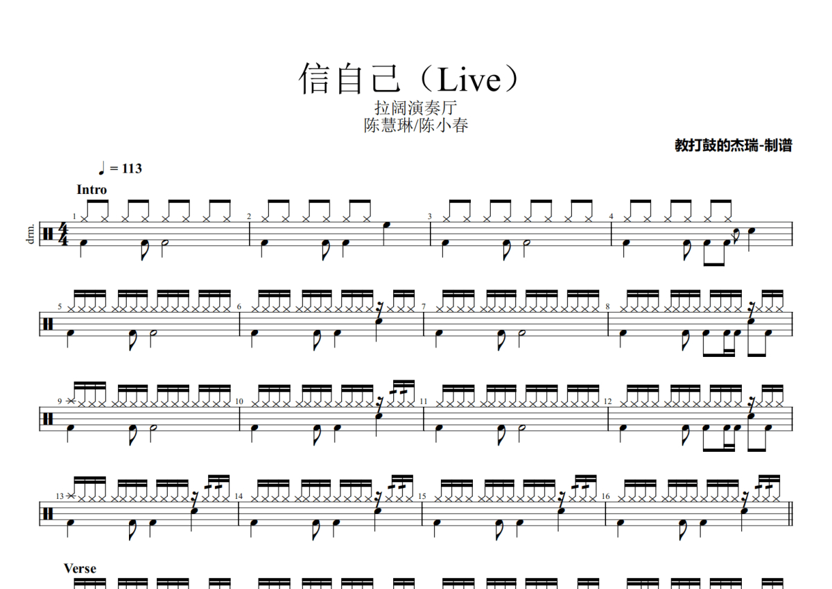 陈慧琳/陈小春《信自己(Live)》架子鼓谱 - 拉阔演奏厅