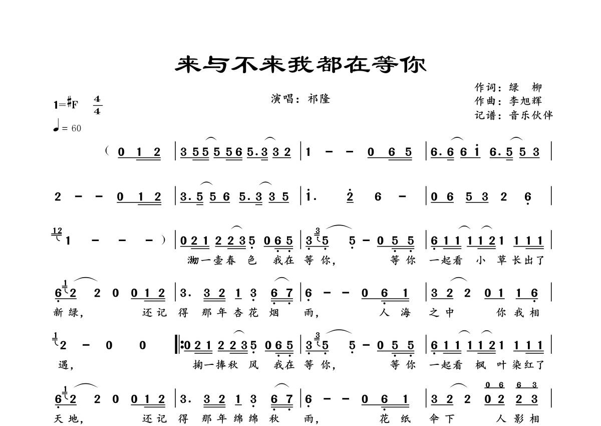 《来与不来我都在等你》是祁隆演唱的一首歌曲,拍号为4/4拍,歌曲速度为每分钟60拍,这份简谱共有一张高清图谱,图谱由 @音乐伙伴 编配上传。