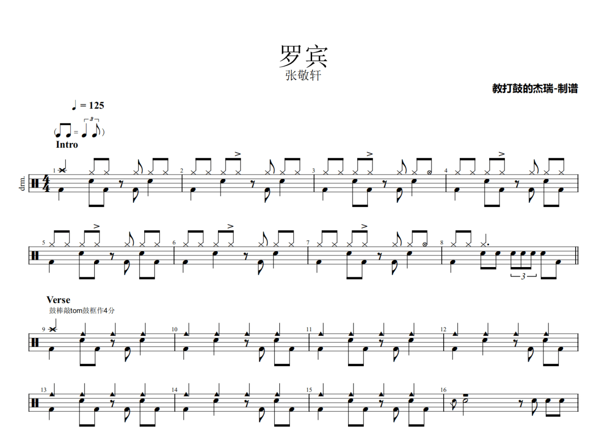 《罗宾》是张敬轩演唱的一首歌曲,拍号为4/4拍,歌曲速度为每分钟125拍,这份架子鼓谱共有三张高清图谱,图谱由 @Jerry 编配上传,图谱使用五线谱编配,使用这份罗宾架子鼓谱,你将能够轻松地敲打出这首张敬轩的罗宾,快来尝试吧。