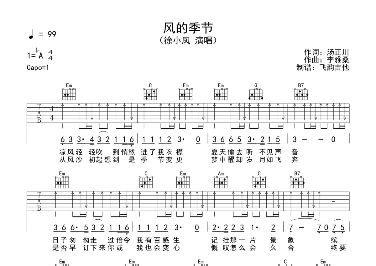 徐小凤《风的季节》吉他谱 - G调弹唱六线谱