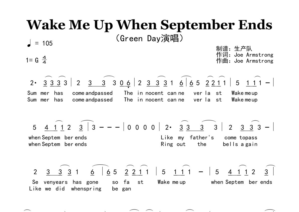 《Wake Me Up When September Ends》是Green Day演唱的一首歌曲,原版简谱,拍号为4/4拍,歌曲速度为每分钟105拍,这份简谱共有两张高清图谱,图谱由 @生产队 编配上传。
