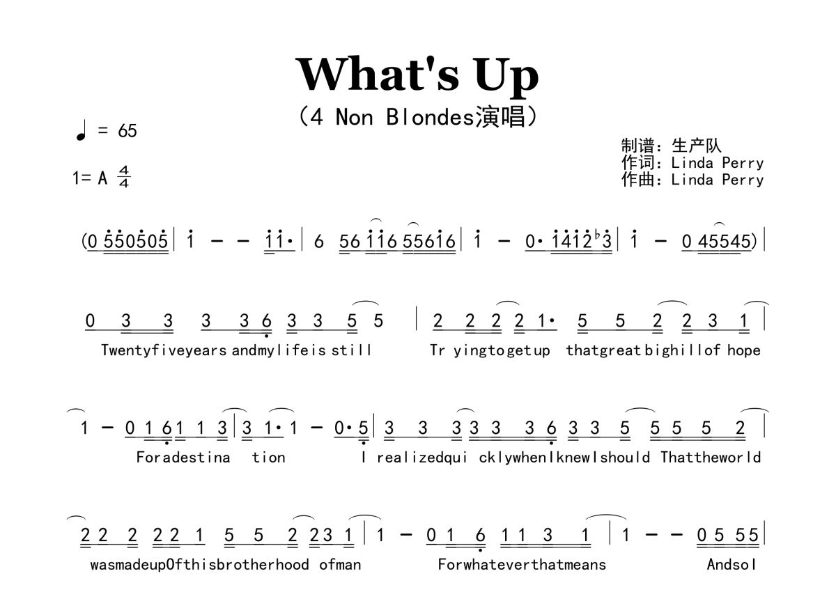 《What's Up》是4 Non Blondes演唱的一首歌曲,原版简谱,拍号为4/4拍,歌曲速度为每分钟65拍,这份简谱共有两张高清图谱,图谱由 @生产队 编配上传。