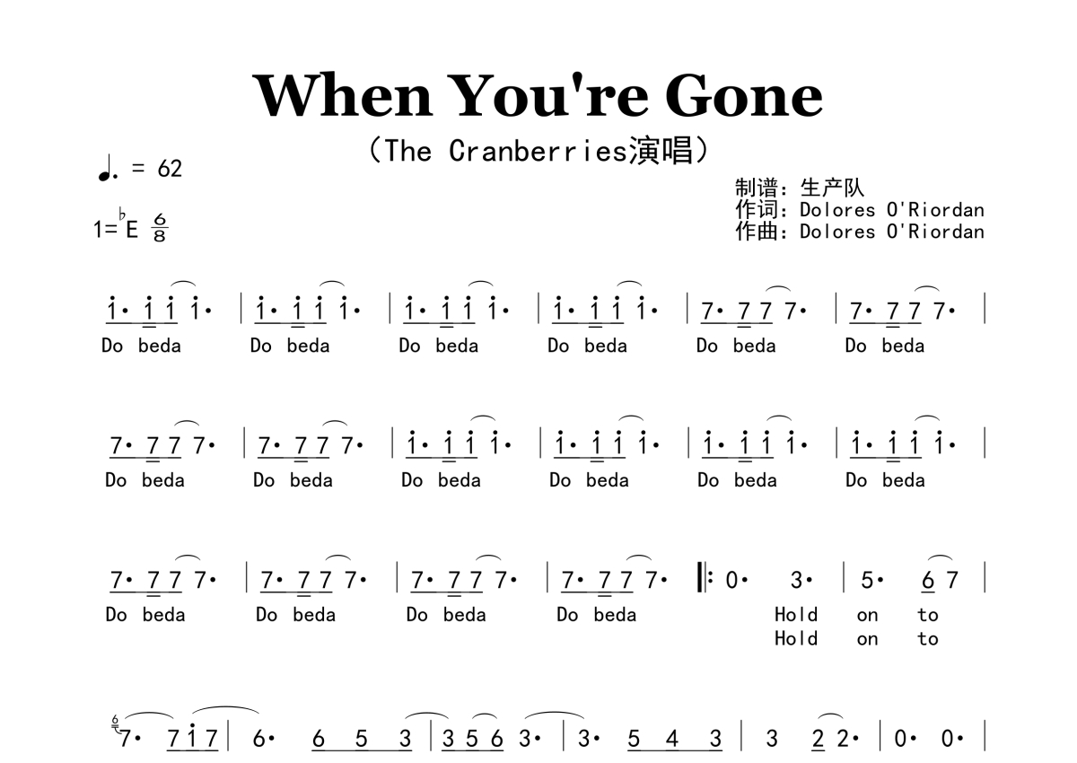 《When You're Gone》是The Cranberries演唱的一首歌曲,原版简谱,拍号为6/8拍,歌曲速度为每分钟62拍,这份简谱共有两张高清图谱,图谱由 @生产队 编配上传。