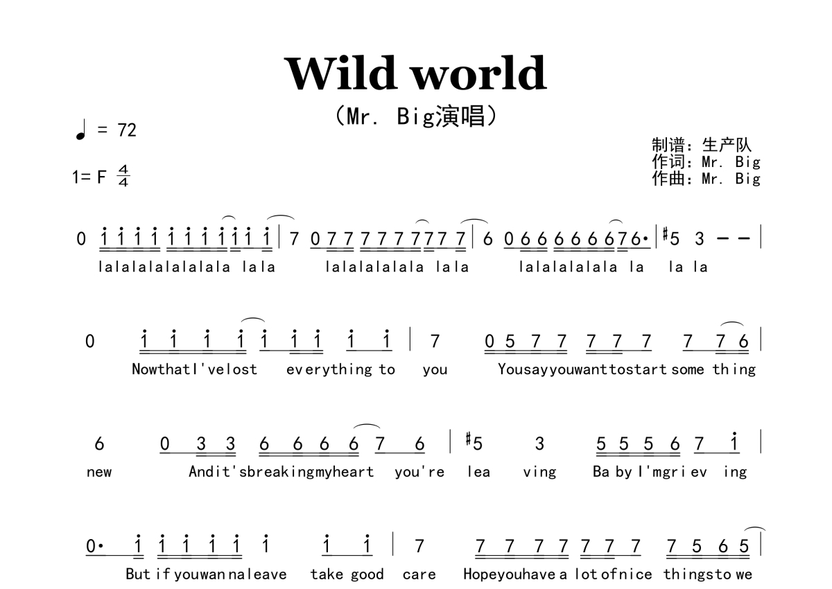 《Wild World》是Mr. Big演唱的一首歌曲,原版简谱,拍号为4/4拍,歌曲速度为每分钟72拍,这份简谱共有两张高清图谱,图谱由 @生产队 编配上传。