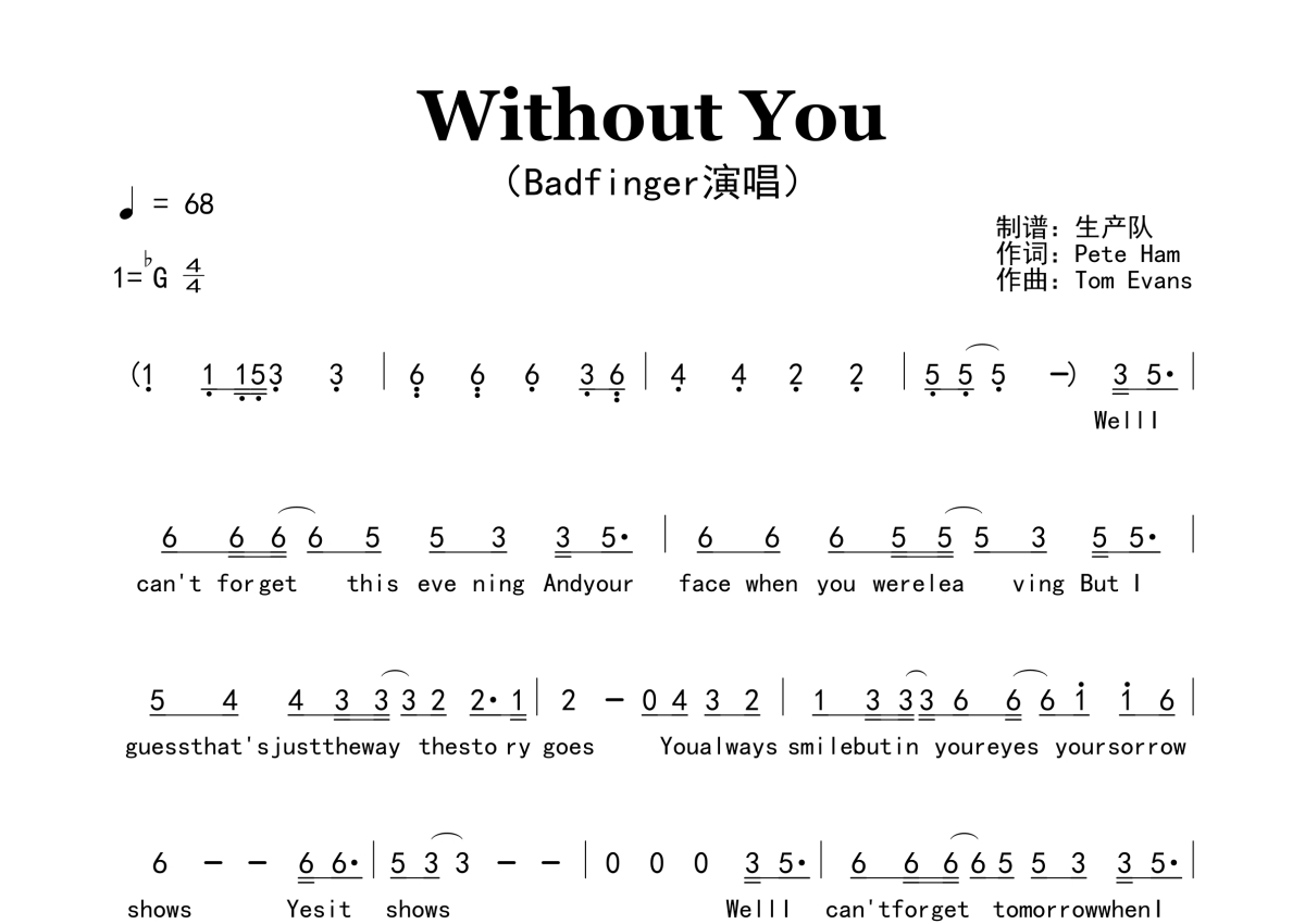 《Without You》是Badfinger演唱的一首歌曲,原版简谱,拍号为4/4拍,歌曲速度为每分钟68拍,这份简谱共有两张高清图谱,图谱由 @生产队 编配上传。