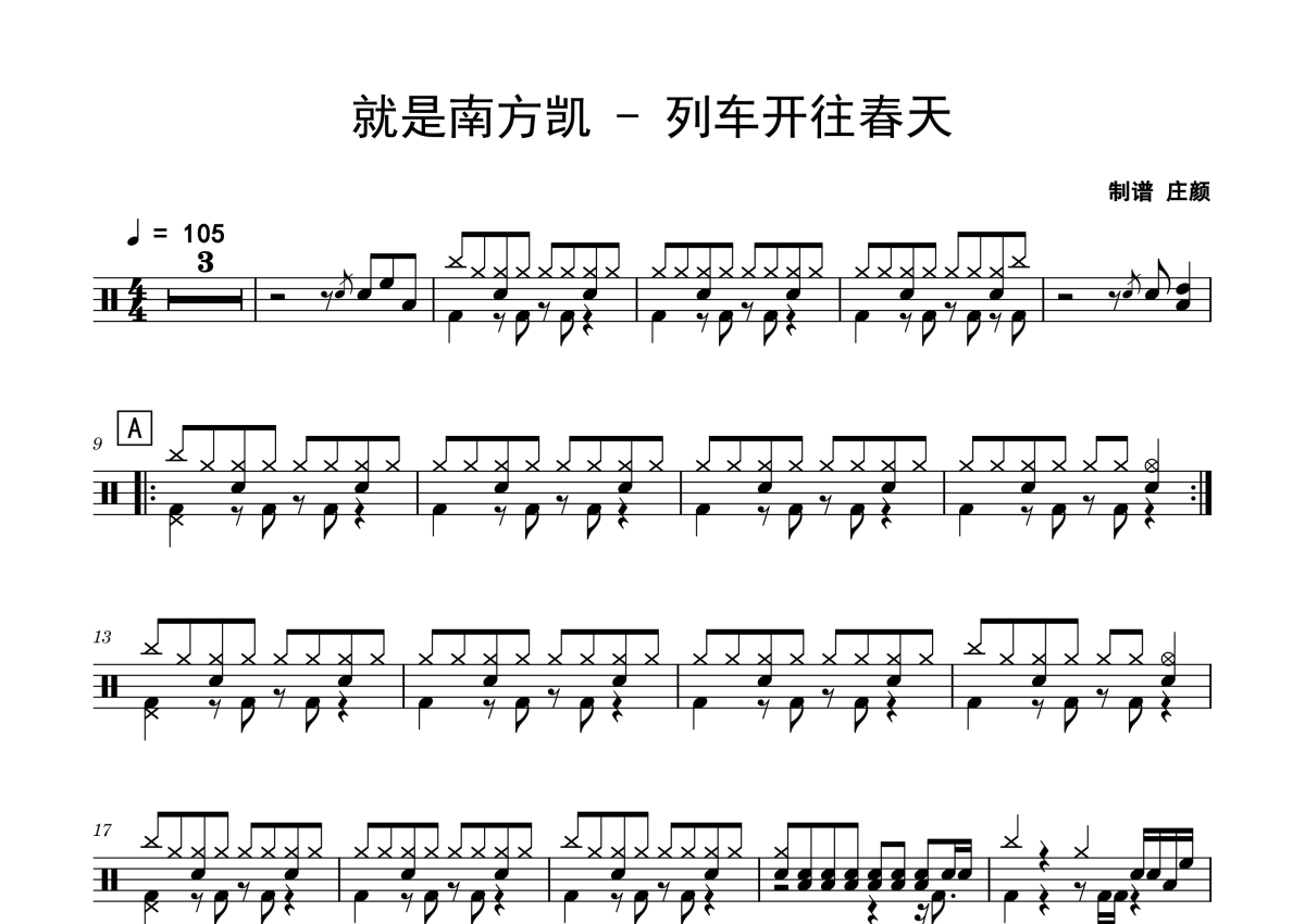 《列车开往春天》是就是南方凯演唱的一首歌曲,这份架子鼓谱共有两张高清图谱,图谱由 @庄颜 编配上传,图谱使用五线谱编配,使用这份列车开往春天架子鼓谱,你将能够轻松地敲打出这首就是南方凯的列车开往春天,快来尝试吧。