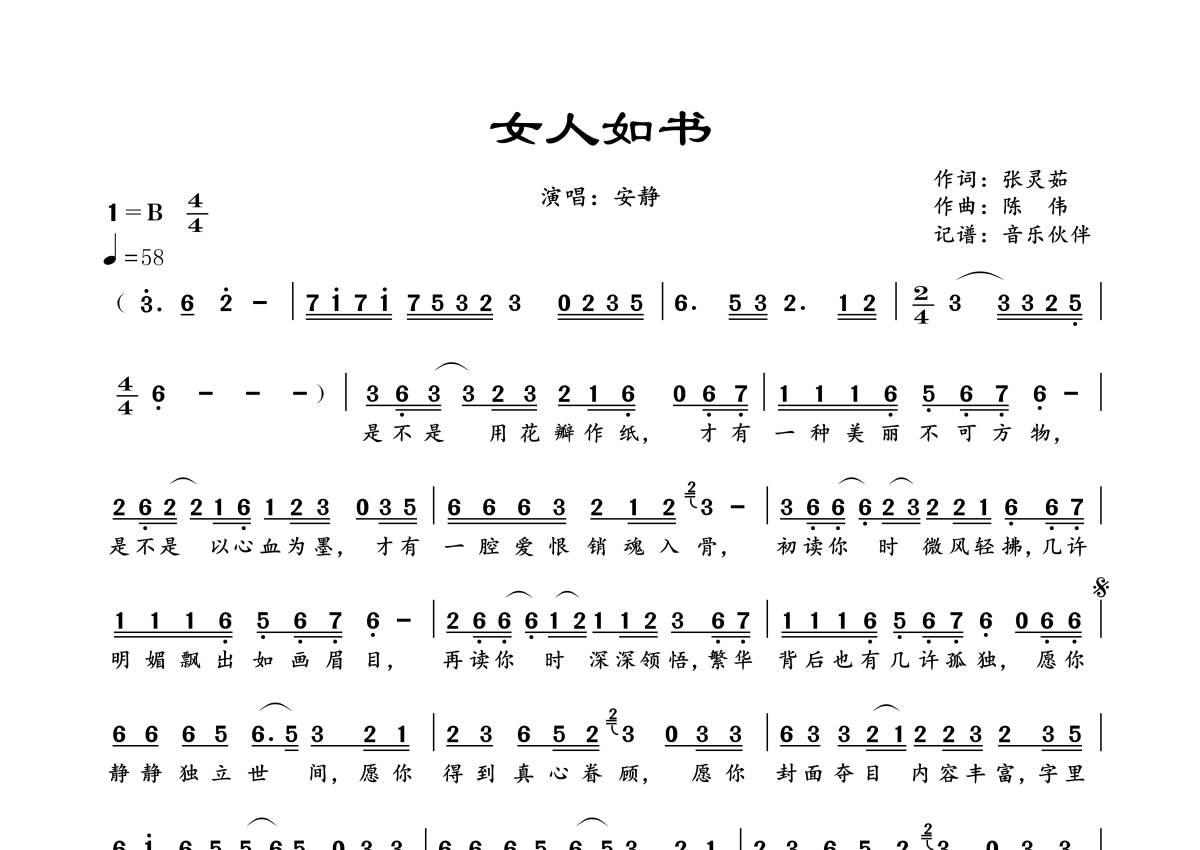 《女人如书》是安静演唱的一首歌曲,拍号为4/4拍,歌曲速度为每分钟58拍,这份简谱共有一张高清图谱,图谱由 @音乐伙伴 编配上传。