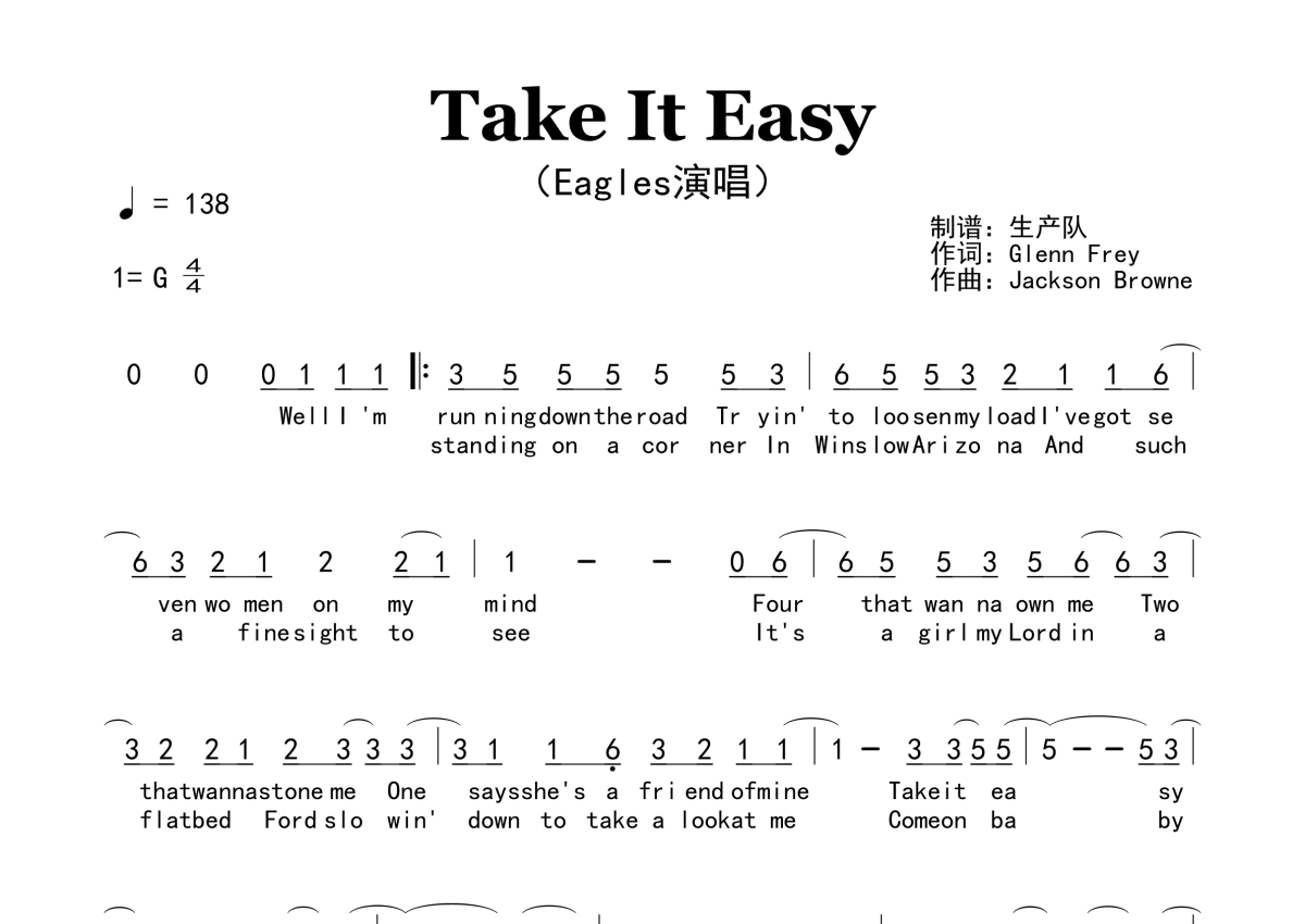 《Take It Easy》是Eagles演唱的一首歌曲,原版简谱,拍号为4/4拍,歌曲速度为每分钟138拍,这份简谱共有两张高清图谱,图谱由 @生产队 编配上传。
